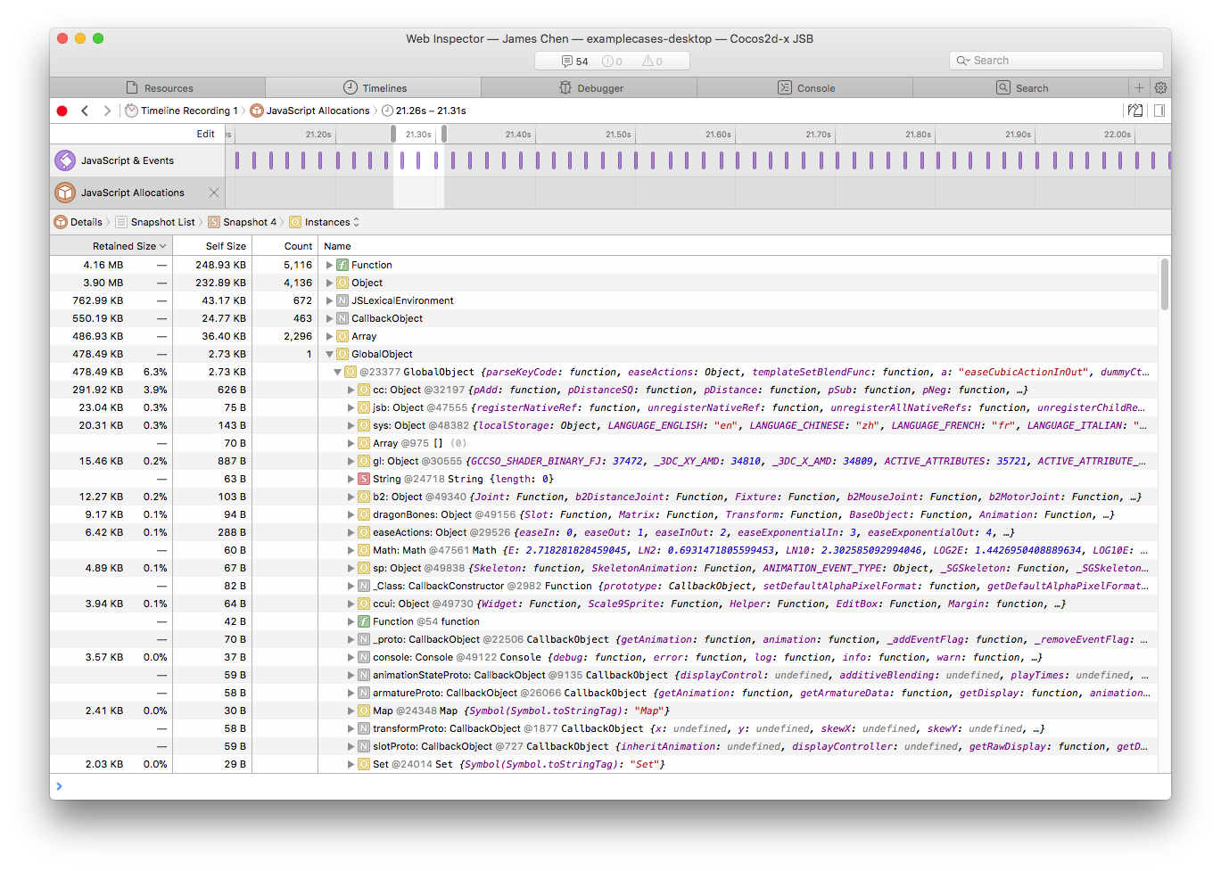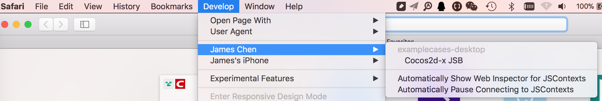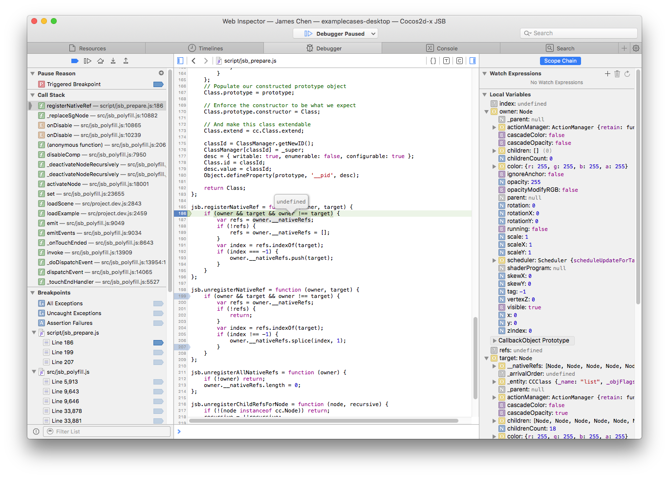 - Click Safari menu, select Develop -> your Mac device name -> Cocos2d-x JSB will automatically open the Web Inspector page, and then you can set breakpoints, Timeline profile, console and other operations.