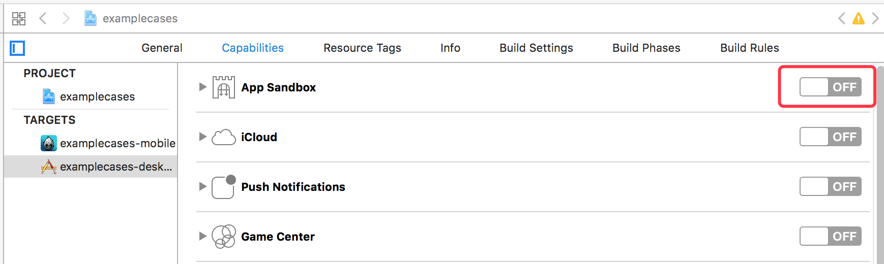 - Add entitlements file to Xcode project, skip this step if entitlements exist. If it does not exist, open the App Sandbox in the Capabilities setting of the project, and then close again. At this point, the .entitlements file is automatically added to the project.
