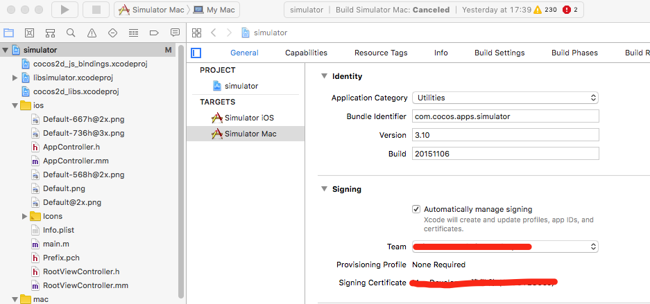 - Signature: General -> Choose your Mac Project -> Signing -> Choose your Developer Certificate