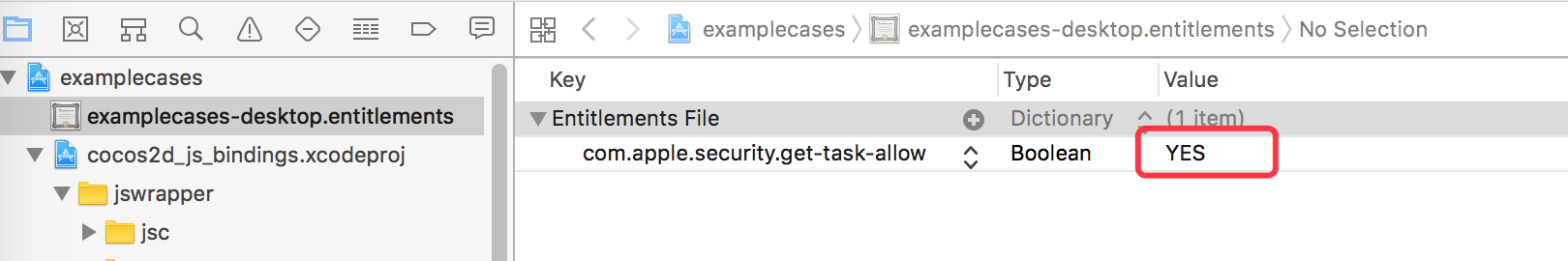 - Open the entitlements file, add com.apple.security.get-task-allow, the value type is Boolean, the value is YES.