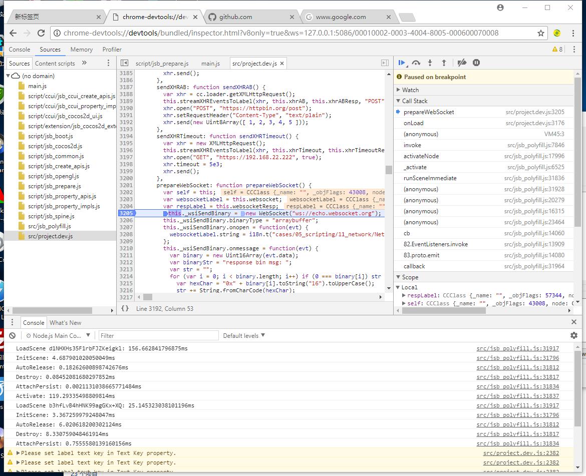 - Open with Chrome: chrome-devtools://devtools/bundled/inspector.html?v8only=true&ws=xxx.xxx.xxx.xxx:5086/00010002-0003-4004-8005-000600070008,